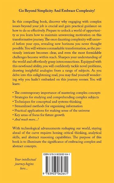 Go Beyond Simplicity And Embrace Complexity! In this compelling book, discover why engaging with complex issues beyond your work is crucial and gain practical guidance on how to do so effectively. Prepare to unlock a world of opportunity as you learn how to maintain unwavering motivation on this transformative journey. The once daunting complexity will unravel before your eyes, revealing new horizons you never thought possible. You will witness a remarkable transformation, as the previously intricate becomes clear, and even the most formidable challenges become within reach. Sharpen your understanding of the world and effortlessly grasp interconnections. Equipped with this newfound ability, you will confidently tackle novel problems, drawing insightful analogies from a range of subjects. As you delve into this enlightening read, you may find yourself wondering why you hadn't embarked on this journey sooner. You will learn: ¿ The contemporary importance of mastering complex concepts ¿ Strategies for studying and comprehending complex subjects ¿ Techniques for conceptual and systems thinking ¿ Streamlined methods for organizing information ¿ Practical applications for making sense of the universe ¿ Key areas of focus for future growth ¿ And much more...! With technological advancements reshaping our world, staying ahead of the curve requires honing critical thinking, analytical skills, and abstract reasoning capabilities. The purpose of this book is to illuminate the significance of embracing complex and abstract concepts.