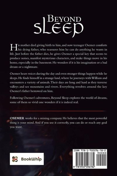 His mother died giving birth to him, and now teenager Osemer comforts his dying father, who reassures him he can do anything he wants in life. Just before the father dies, he gives Osemer a special key that seems to produce noises, manifest mysterious characters, and make things move in his home, especially in the basement. He wonders if it is his imagination or a bad dream or a nightmare. Osemer hears voices during the day and even stranger things happen while he sleeps. He finds himself in a strange land, where he journeys with William and encounters a variety of animals. Their days are long and hard as they traverse valleys and see mountains and rivers. Everything revolves around the key Osemer's father bestowed on him. Following Osemer's adventures, Beyond Sleep explores the world of dreams, some of them so vivid one wonders if it is indeed real.