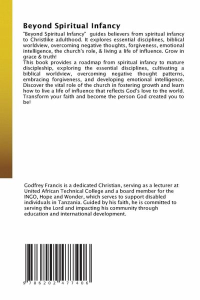 "Beyond Spiritual Infancy" guides believers from spiritual infancy to Christlike adulthood. It explores essential disciplines, biblical worldview, overcoming negative thoughts, forgiveness, emotional intelligence, the church's role, & living a life of influence. Grow in grace & truth!This book provides a roadmap from spiritual infancy to mature discipleship, exploring the essential disciplines, cultivating a biblical worldview, overcoming negative thought patterns, embracing forgiveness, and developing emotional intelligence. Discover the vital role of the church in fostering growth and learn how to live a life of influence that reflects God's love to the world. Transform your faith and become the person God created you to be!