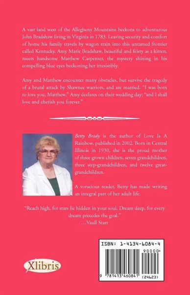 A vast land west of the Allegheny Mountains beckons to adventurous John Bradshaw living in Virginia in 1783. Leaving security and comfort of home his family travels by wagon train into this untamed frontier called Kentucky. Amy Marie Bradshaw, beautiful and feisty as a kitten, meets handsome Matthew Carpenter, the mystery shining in his compelling blue eyes beckoning her irresistibly. Amy and Matthew encounter many obstacles, but survive the tragedy of a brutal attack by Shawnee warriors, and are married. 'I was born to love you, Matthew," Amy declares on their wedding day; 'and I shall love and cherish you forever."