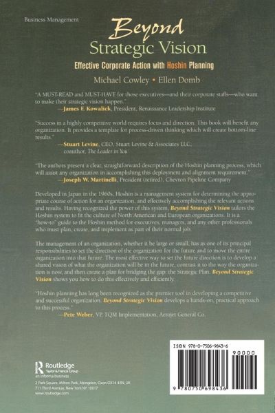 Hoshin is a system which was developed in Japan in the 1960's, and is a derivative of Management By Objectives (MBO). It is a Management System for determining the appropriate course of action for an organization, and effectively accomplishing the relevant actions and results. Having recognized the power of this system, Beyond Strategic Vision tailors the Hoshin system to fit the culture of North American and European organizations. It is a "how-to" guide to the Hoshin method for executives, managers, and any other professionals who must plan as part of their normal job. The management of an organization, whether it be large or small, has as one of its principal responsibilities setting the direction of the organization for the future. The most effective way to set the future direction is to develop a shared vision of what the organization will be in the future, contrast it to the way the organization is now, and then to create a plan for bridging the gap: the Strategic Plan. Beyond Strategic Vision shows you how to do this effectively and efficiently.