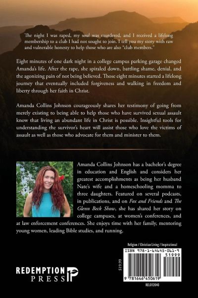 The night I was raped, my soul was murdered, and I received a lifelong membership to a club I had not sought to join. I tell you my story with raw and vulnerable honesty to help those who are also "club members." Eight minutes of one dark night in a college campus parking garage changed Amanda's life. After the rape, she spiraled down, battling shame, denial, and the agonizing pain of not being believed. Those eight minutes started a lifelong journey that eventually included forgiveness and walking in freedom and liberty through her faith in Christ. Amanda Collins Johnson courageously shares her testimony of going from merely existing to being able to help those who have survived sexual assault know that living an abundant life in Christ is possible. Insightful tools for understanding the survivor's heart will assist those who love the victims of assault as well as those who advocate for them and minister to them.