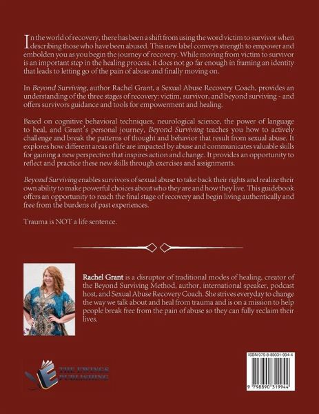 In the world of recovery, there has been a shift from using the word victim to survivor when describing those who have been abused. This new label conveys strength to empower and embolden you as you begin the journey of recovery. While moving from victim to survivor is an important step in the healing process, it does not go far enough in framing an identity that leads to letting go of the pain of abuse and finally moving on. In Beyond Surviving, author Rachel Grant, a Sexual Abuse Recovery Coach, provides an understanding of the three stages of recovery: victim, survivor, and beyond surviving - and offers survivors guidance and tools for empowerment and healing. Based on cognitive behavioral techniques, neurological science, the power of language to heal, and Grant's personal journey, Beyond Surviving teaches you how to actively challenge and break the patterns of thought and behavior that result from sexual abuse. It explores how different areas of life are impacted by abuse and communicates valuable skills for gaining a new perspective that inspires action and change. It provides an opportunity to reflect and practice these new skills through exercises and assignments. Beyond Surviving enables survivors of sexual abuse to take back their rights and realize their own ability to make powerful choices about who they are and how they live. This guidebook offers an opportunity to reach the final stage of recovery and begin living authentically and free from the burdens of past experiences. Trauma is NOT a life sentence.