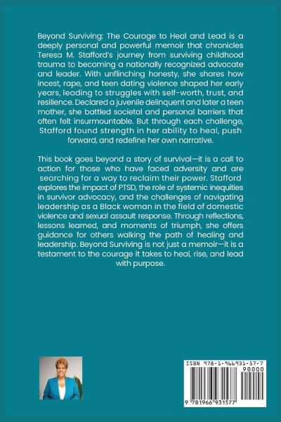 Beyond Surviving: The Courage to Heal and Lead "A Journey of Post-Traumatic Growth and Healing After Incest and Childhood Sex Abuse" A powerful memoir of resilience, healing, and leadership from a nationally recognized advocate and survivor. Teresa M. Stafford's Beyond Surviving: The Courage to Heal and Lead is more than a memoir-it's a testament to the power of healing and transformation. As a survivor of incest, rape, and teen dating violence, Teresa shares her deeply personal journey through trauma, survival, and ultimately, leadership. From being labeled a juvenile delinquent to becoming a teen mother and later leading a national movement to support survivors, she takes readers through the moments that shaped her path to advocacy. Through raw honesty and deep introspection, Teresa reveals how trauma manifested in her life, influencing her parenting, relationships, and career. She candidly discusses the impact of PTSD, hypervigilance, and racism as a Black woman navigating the field of victim advocacy. But at the heart of her story is resilience-her fight to reclaim her voice, her purpose, and her power. This book is a call to action for survivors and advocates alike. Teresa shares the lessons she learned about healing, letting go of what cannot be controlled, and stepping into leadership despite past pain. Drawing on her experiences leading survivor-focused organizations and training professionals nationwide, she provides insight into creating trauma-informed spaces, dismantling systemic barriers, and advocating for meaningful change. Whether you are a survivor, an advocate, or someone seeking inspiration in the face of adversity, Beyond Surviving offers a roadmap to transformation. Teresa's journey proves that healing is possible, leadership is attainable, and survival is only the beginning. Perfect for readers of memoirs on trauma recovery, personal growth, and leadership, this book is a must-read for anyone looking to turn pain into purpose. Order your copy today and take the first step toward healing, empowerment, and leadership.