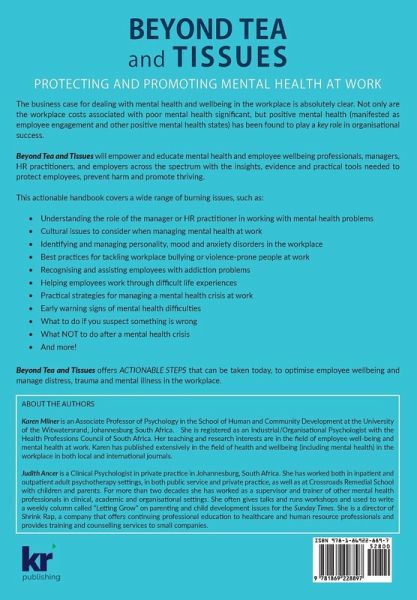 The business case for dealing with mental health and wellbeing in the workplace is absolutely clear. Not only are the workplace costs associated with poor mental health significant, but positive mental health (manifested as employee engagement and other positive mental health states) has been found to play a key role in organisational success. Beyond Tea and Tissues will empower and educate mental health and employee wellbeing professionals, managers, HR practitioners, and employers across the spectrum with the insights, evidence and practical tools needed to protect employees, prevent harm and promote thriving. This actionable handbook covers a wide of range of burning issues, such as: - Understanding the role of the manager or HR practitioner in working with mental health problems - Cultural issues to consider when managing mental health at work - Identifying and managing personality, mood and anxiety disorders in the workplace - Best practices for tackling workplace bullying or violence-prone people at work - Recognising and assisting employees with addiction problems - Helping employees work through difficult life experiences - Practical strategies for managing a mental health crisis at work - Early warning signs of mental health difficulties - What to do if you suspect something is wrong - What NOT to do after a mental health crisis - And more! Beyond Tea and Tissues offers ACTIONABLE STEPS that can be taken today, to optimise employee wellbeing and manage distress, trauma and mental illness in the workplace.