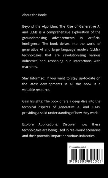 This book is a comprehensive exploration of the groundbreaking advancements in artificial intelligence, specifically focusing on generative AI and large language models (LLMs). This book delves into the transformative potential of these technologies and their profound implications for various industries and aspects of human life. Key Themes and Insights: Understanding Generative AI and LLMs: The book provides a clear and accessible explanation of these complex technologies, demystifying their underlying principles and capabilities. It explores how generative AI can create new content, such as text, images, and music, while LLMs excel at understanding and generating human language. Applications and Impact: The authors discuss the wide-ranging applications of generative AI and LLMs across different domains, including healthcare, education, finance, and creative arts. They highlight the potential benefits, such as improved efficiency, personalized experiences, and new forms of creativity, as well as the challenges and ethical considerations that arise. Ethical Implications: The book addresses the ethical implications of generative AI and LLMs, including concerns about bias, misinformation, and job displacement. It explores the importance of responsible development and deployment of these technologies to ensure their positive impact on society.