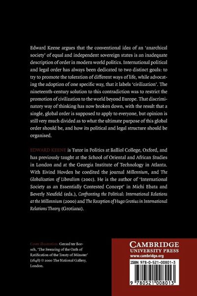 Edward Keene argues that the conventional idea of an 'anarchical society' of equal and independent sovereign states is an inadequate description of order in modern world politics. International political and legal order has always been dedicated to two distinct goals: to try to promote the toleration of different ways of life, while advocating the adoption of one specific way, that it labels 'civilization'. The nineteenth-century solution to this contradiction was to restrict the promotion of civilization to the world beyond Europe. That discriminatory way of thinking has now broken down, with the result that a single, global order is supposed to apply to everyone, but opinion is still very much divided as to what the ultimate purpose of this global order should be, and how its political and legal structure should be organised.