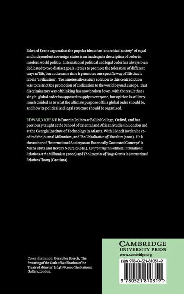 Edward Keene argues that the conventional idea of an 'anarchical society' of equal and independent sovereign states is an inadequate description of order in modern world politics. International political and legal order has always been dedicated to two distinct goals: to try to promote the toleration of different ways of life, while advocating the adoption of one specific way, that it labels 'civilization'. The nineteenth-century solution to this contradiction was to restrict the promotion of civilization to the world beyond Europe. That discriminatory way of thinking has now broken down, with the result that a single, global order is supposed to apply to everyone, but opinion is still very much divided as to what the ultimate purpose of this global order should be, and how its political and legal structure should be organised.