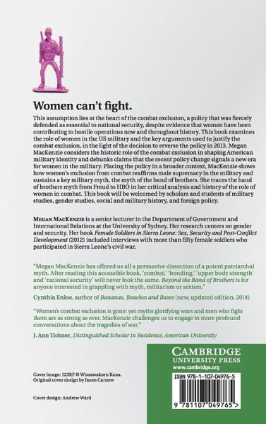 Women can't fight. This assumption lies at the heart of the combat exclusion, a policy that was fiercely defended as essential to national security, despite evidence that women have been contributing to hostile operations now and throughout history. This book examines the role of women in the US military and the key arguments used to justify the combat exclusion, in the light of the decision to reverse the policy in 2013. Megan MacKenzie considers the historic role of the combat exclusion in shaping American military identity and debunks claims that the recent policy change signals a new era for women in the military. MacKenzie shows how women's exclusion from combat reaffirms male supremacy in the military and sustains a key military myth, the myth of the band of brothers. This book will be welcomed by scholars and students of military studies, gender studies, social and military history, and foreign policy.