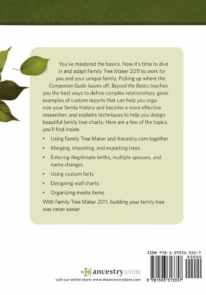 You've mastered the basics. Now it's time to dive in and adapt Family Tree Maker 2011 to work for you and your unique family. Picking up where the Companion Guide leaves off, Beyond the Basics teaches you the best ways to define complex relationships; gives examples of custom reports that can help you organize your family history and become a more effective researcher; and explains techniques to help you design beautiful family tree charts. Here are a few of the topics you'll find inside: Using Family Tree Maker and Ancestry.com together Merging, importing, and exporting trees Entering illegitimate births, multiple spouses, and name changes Using custom facts Designing wall charts Organizing media items With Family Tree Maker 2011, building your family tree was never easier.