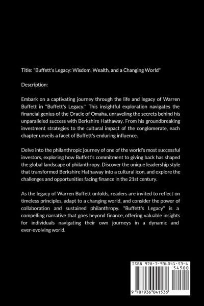 Title: "Buffett's Legacy: Wisdom, Wealth, and a Changing World" Description: Embark on a captivating journey through the life and legacy of Warren Buffett in "Buffett's Legacy." This insightful exploration navigates the financial genius of the Oracle of Omaha, unraveling the secrets behind his unparalleled success with Berkshire Hathaway. From his groundbreaking investment strategies to the cultural impact of the conglomerate, each chapter unveils a facet of Buffett's enduring influence. Delve into the philanthropic journey of one of the world's most successful investors, exploring how Buffett's commitment to giving back has shaped the global landscape of philanthropy. Discover the unique leadership style that transformed Berkshire Hathaway into a cultural icon, and explore the challenges and opportunities facing finance in the 21st century. As the legacy of Warren Buffett unfolds, readers are invited to reflect on timeless principles, adapt to a changing world, and consider the power of collaboration and sustained philanthropy. "Buffett's Legacy" is a compelling narrative that goes beyond finance, offering valuable insights for individuals navigating their own journeys in a dynamic and ever-evolving world.
