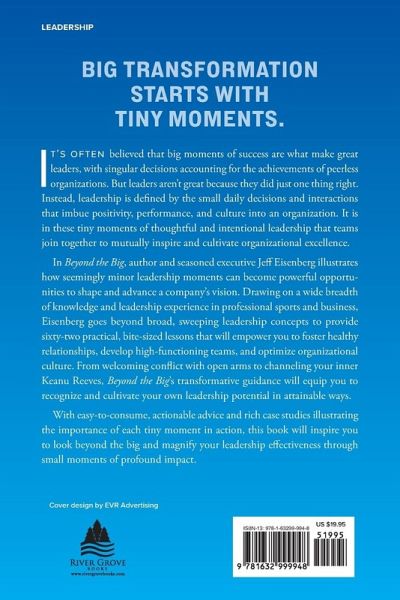 Big transformation starts with tiny moments. It's often believed that big moments of success are what make great leaders, with singular decisions accounting for the achievements of peerless organizations. But leaders aren't great because they did just one thing right. Instead, leadership is defined by the small daily decisions and interactions that imbue positivity, performance, and culture into an organization. It is in these tiny moments of thoughtful and intentional leadership that teams join together to mutually inspire and cultivate organizational excellence. In Beyond the Big, author and seasoned executive Jeff Eisenberg illustrates how seemingly minor leadership moments can become powerful opportunities to shape and advance a company's vision. Drawing on a wide breadth of knowledge and leadership experience in professional sports and business, Eisenberg goes beyond broad, sweeping leadership concepts to provide sixty-two practical, bite-sized lessons that will empower you to foster healthy relationships, develop high-functioning teams, and optimize organizational culture. From welcoming conflict with open arms to channeling your inner Keanu Reeves, Beyond the Big's transformative guidance will equip you to recognize and cultivate your own leadership potential in attainable ways. With easy-to-consume, actionable advice and rich case studies illustrating the importance of each tiny moment in action, this book will inspire you to look beyond the big and magnify your leadership effectiveness through small moments of profound impact.