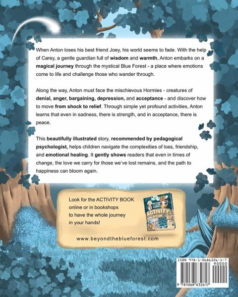 Beautifully illustrated story helping children understand grief. After losing his best friend, Anton embarks on a magical journey through the Blue Forest with a wise guardian, Carey, meeting creatures that embody emotions and finding healing.