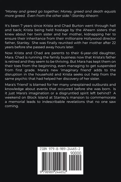 "Money and greed go together; Money, greed and death equals more greed. Even from the other side."-Stanley Ahearn It's been 7 years since Krista and Chad Burton went through hell and back; Krista being held hostage by the Ahearn sisters that knew about her twin sister and her mother, kidnapping her to ensure their inheritance from their millionaire Hollywood director father, Stanley. She was finally reunited with her mother after 22 years before she passed away hours later. Now Krista and Chad are parents to their 6-year-old daughter, Mara. Chad is running the family business now that Krista's father is retired and they seem to be thriving. But Mara has kept them on their toes from the beginning, even managing to get suspended from first grade. Mara's new 'imaginary friend' adds to the disruption in the household and Krista seeks out help from the same psychic that had helped her discovery of her sister. Mara's 'friend' is blamed for her many unexplained outbursts and knowledge about events that occurred before she was born. Is it just Mara's imagination or a disgruntled spirit left behind? A weekend on Block Island at Stanley's mansion to commemorate a memorial leads to indescribable revelations that no one saw coming.