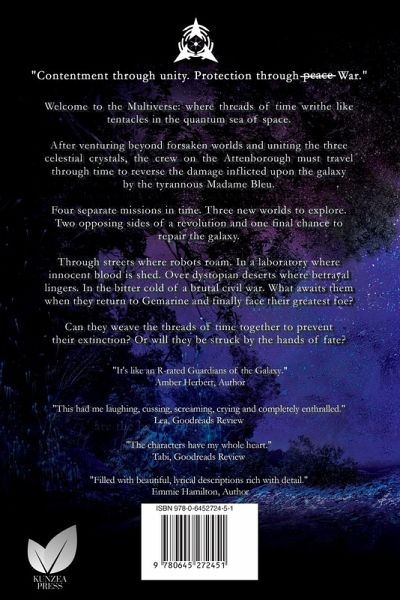 "Contentment through unity. Protection through war." Welcome to the Multiverse: where threads of time writhe like tentacles in the quantum sea of space. After venturing beyond forsaken worlds and uniting the three celestial crystals, the crew on the Attenborough must travel through time to reverse the damage inflicted upon the galaxy by the tyrannous Madame Bleu. Four separate missions in time. Three new worlds to explore. Two opposing sides of a revolution and one final chance to repair the galaxy. Through streets where robots roam. In a laboratory where innocent blood is shed. Over dystopian deserts where betrayal lingers. In the bitter cold of a brutal civil war. What awaits them when they return to Gemarine and finally face their greatest foe? Can they weave the threads of time together to prevent their extinction? Or will they be struck by the hands of fate?