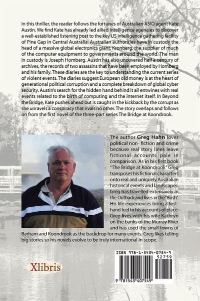 In this thriller, the reader follows the fortunes of Australian ASIO agent Kate Austin. We find Kate has already led allied intelligence agencies to discover a well-established listening post to the key US intelligence gathering facility of Pine Gap in Central Australia. Australian authorities have in custody the head of a massive global electronics giant, Kronberg, the supplier of much of the computer equipment to governments around the world. The man in custody is Joseph Homberg. Austin has also uncovered half a century of archives, the records of two assassins that have been employed by Homberg and his family. These diaries are the key to understanding the current series of violent events. The diaries suggest European old money is at the heart of generational political corruption and a complete breakdown of global cyber security. Austins search for the hidden hand behind it all entwines with real events related to the birth of computing and the internet itself. In Beyond the Bridge, Kate pushes ahead but is caught in the kickback by the corrupt as she unravels a conspiracy that rivals no other. The story overlaps and follows on from the first novel of the three-part series The Bridge at Koondrook.