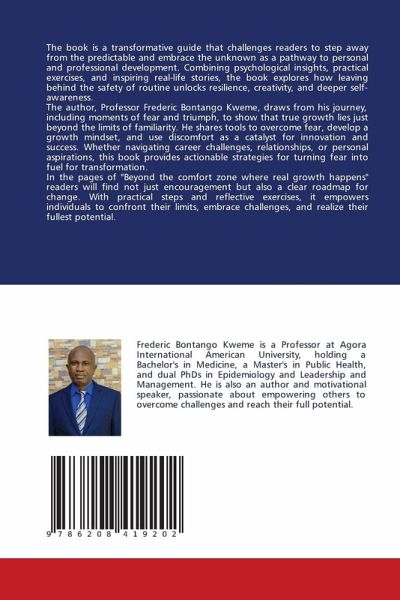 The book is a transformative guide that challenges readers to step away from the predictable and embrace the unknown as a pathway to personal and professional development. Combining psychological insights, practical exercises, and inspiring real-life stories, the book explores how leaving behind the safety of routine unlocks resilience, creativity, and deeper self-awareness.The author, Professor Frederic Bontango Kweme, draws from his journey, including moments of fear and triumph, to show that true growth lies just beyond the limits of familiarity. He shares tools to overcome fear, develop a growth mindset, and use discomfort as a catalyst for innovation and success. Whether navigating career challenges, relationships, or personal aspirations, this book provides actionable strategies for turning fear into fuel for transformation.In the pages of "Beyond the comfort zone where real growth happens" readers will find not just encouragement but also a clear roadmap for change. With practical steps and reflective exercises, it empowers individuals to confront their limits, embrace challenges, and realize their fullest potential.
