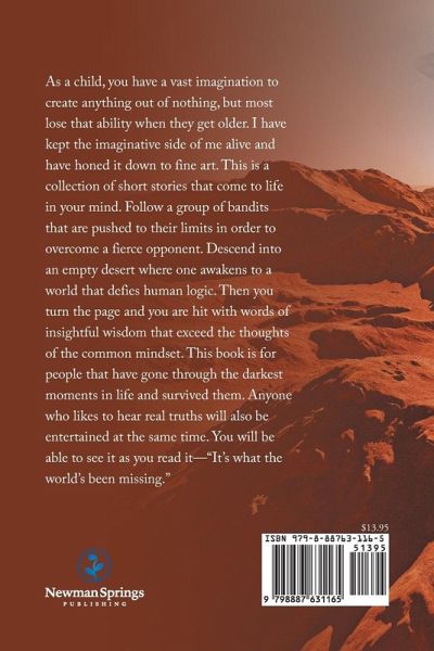 As a child, you have a vast imagination to create anything out of nothing, but most lose that ability when they get older. I have kept the imaginative side of me alive and have honed it down to fine art. This is a collection of short stories that come to life in your mind. Follow a group of bandits that are pushed to their limits in order to overcome a fierce opponent. Descend into an empty desert where one awakens to a world that defies human logic. Then you turn the page and you are hit with words of insightful wisdom that exceed the thoughts of the common mindset. This book is for people that have gone through the darkest moments in life and survived them. Anyone who likes to be told real truths will also be entertained at the same time. You will be able to see it as you read it--"It's what the world's been missing."