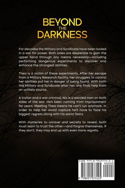 For decades the Military and Syndicate have been locked in a war for power. Both sides are desperate to gain the upper hand through any means necessary-including performing dangerous experiments to discover and enhance the strongest abilities. Thea is a victim of these experiments. After her escape from a Military Research facility, her struggles to control her abilities put her in danger of being found. With both the Military and Syndicate after her, she finds help from an unlikely source. A traitor and a war criminal, Nix is a wanted man on both sides of the war. He's been running from imprisonment for years. Meeting Thea means he can't run anymore. In order to help her avoid capture he'll have to face his biggest regrets along with his worst fears. With mysteries to unravel and secrets to reveal, both must learn to trust the other-and forgive themselves. If they don't, they may end up with even more regrets.
