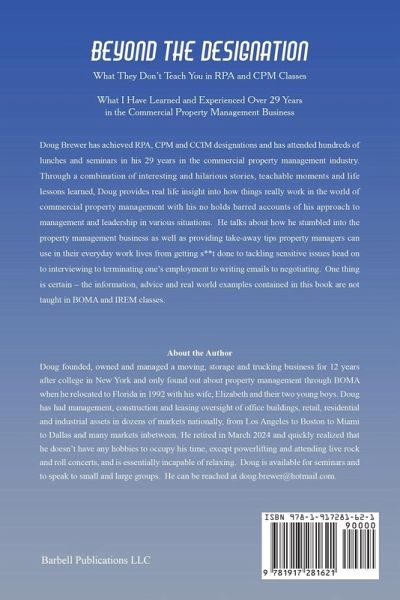 Doug Brewer has achieved RPA, CPM and CCIM designations and has attended hundreds of lunches and seminars in his 29 years in the commercial property management industry. Through a combination of interesting and hilarious stories, teachable moments and life lessons learned, Doug provides real life insight into how things really work in the world of commercial property management with his no holds barred accounts of his approach to management and leadership in various situations. He talks about how he stumbled into the property management business as well as providing take-away tips property managers can use in their everyday work lives from getting s#%& done to tackling sensitive issues head on to interviewing to terminating one's employment to writing emails to negotiating.One thing is certain - the information, advice and real world examples contained in this book are not taught in BOMA and IREM classes.