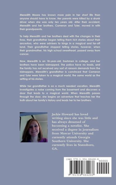 To help Meredith Moore and her brothers deal with the changes in their lives, their grandfather began telling them rich stories about their ancestors, who were advisers to kings in a magical and far-off land. Their grandfather stopped telling stories, however, when their grandmother, his high school sweetheart, passed away from cancer. Now, Meredith is an 18-year-old, freshmen in college, and her brothers have been kidnapped. The police have no leads, and the family has not received any sort of ransom demands from the kidnappers. Meredith's grandfather is convinced that Cameron and Tyler were taken to a magical world, the same world as the setting of his stories. While her grandfather is on a much needed vacation, Meredith investigates a noise coming from the basement and discovers a door that leads to a magical world. When Meredith passes through the door, she begins an adventure that teaches her the truth about her family's history and leads her to her brothers.