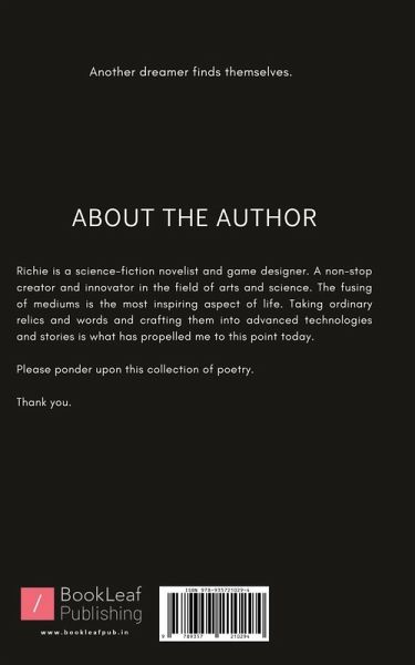 Richie is a science-fiction novelist and game designer. A non-stop creator and innovator in the field of arts and science. The fusing of mediums is the most inspiring aspect of life. Taking ordinary relics and words and crafting them into advanced technologies and stories is what has propelled me to this point today.Please ponder upon this collection of poetry. Thank you.