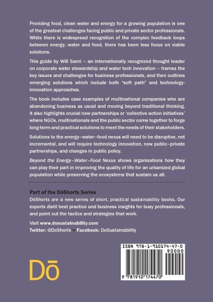 Providing food, clean water and energy for a growing population is one of the greatest challenges facing public and private sector professionals. While there is widespread recognition of the complex feedback loops between energy, water and food, there has been less focus on viable solutions. This guide by Will Sarni - an internationally recognized thought leader on corporate water stewardship and water tech innovation - frames the key issues and challenges for business professionals, and then outlines emerging solutions which include both "soft path" and technology innovation approaches. The book includes case examples of multinational companies who are abandoning business as usual and moving beyond traditional thinking. It also highlights crucial new partnerships or "collective action initiatives" where NGOs, multinationals and the public sector come together to forge practical solutions to meet the needs of their stakeholders. Solutions to the energy-water-food nexus will need to be disruptive, not incremental, and will require technology innovation, new public-private partnerships, and changes in public policy. Beyond the Energy-Food-Water Nexus shows organizations how they can play their part in improving the quality of life for an urbanized global population while preserving the ecosystems that sustain us all.