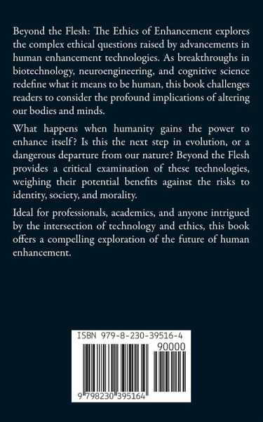 Beyond the Flesh: The Ethics of Enhancement explores the complex ethical questions raised by advancements in human enhancement technologies. As breakthroughs in biotechnology, neuroengineering, and cognitive science redefine what it means to be human, this book challenges readers to consider the profound implications of altering our bodies and minds. What happens when humanity gains the power to enhance itself? Is this the next step in evolution, or a dangerous departure from our nature? Beyond the Flesh provides a critical examination of these technologies, weighing their potential benefits against the risks to identity, society, and morality. Ideal for professionals, academics, and anyone intrigued by the intersection of technology and ethics, this book offers a compelling exploration of the future of human enhancement.