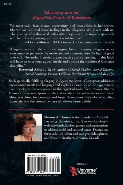 Advance praise for Beyond the Forests of Yesteryears "We meet pain, fear, shame, uncertainty, and insecurities in her stories. Sharon has captured those feelings in the allegories she shares with us. The journey of a thousand miles often begins with a single step-walk with her; this is a journey you won't want to miss!" -Donna Messer, CEO, ConnectUs Communications, Canada "A significant contribution to emerging literature using allegory as an instrument to persuade the reader toward a journey into the fight of good over evil. The author's stories are persuasive and compelling . . . this book will have an enormous appeal inside and outside the traditional Christian discipline." -Reverend Anita L. Keith, author of Sacred Children, Sacred Teachers, Sacred Learning, For Our Children, Our Sacred Beings, and Rise Up! Each spiritually fulfilling allegory in Beyond the Forests of Yesteryears addresses our essential needs and longings and explores a number of life experiences, from the desire for acceptance to the regret of unfulfilled dreams. Sharon Dumas's characters spring to life and tackle universal anxieties and fears. After searching for courage and hope throughout life's obstacles, they ultimately find the strength where it's always been: within.