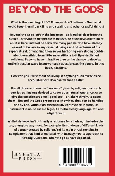 What is the meaning of life? If people didn't believe in God, what would keep them from killing and stealing and other dreadful things? Beyond the Gods isn't in the business-as it makes clear from the outset-of trying to get people to believe, or disbelieve, anything at all. It is here, instead, to serve the many people who have already ceased to believe in any celestial beings and other forms of the supernatural. Or who find themselves harboring very strong doubts about everything from little superstitions to fully-established religions. But who haven't had the time or the chance to develop entirely secular ways to answer such questions as the above. In this book, it is done. How can you live without believing in anything? Can miracles be accounted for? How can we face death? For all those who see the "answers" given by religion to all such queries as illusions devised to cover up a natural ignorance, or to give the questioners a feel-good sop-or, alternatively, to scare them-Beyond the Gods proceeds to show how they can be handled, one by one, without an otherworldly contrivance in sight. Its instrument is no-nonsense logic, its method easy language, wit and a light touch. While this book isn't primarily a rationale for atheism, it includes that too, along the way-see, for example, its rundown of different kinds of danger created by religion. Yet its main thrust remains to complement that kind of material, with its easy how-to approach to life's Big Questions, after the gods have departed.