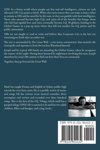 2290- In a future world where people can buy and sell intelligence, citizens are each allocated 100 1.Q. points at birth. When they turn sixteen they can make a choice either to remain as 100s and be cared for by the state, or they can gamble with their intelligence. Those who succeed become high I.Q.s and enjoy all of the benefits this brings; those who fail lead squalid lives and some eventually become I.Q. 30 glidiots, battling in the Glidiot Games in a pop-up maze where they kill one another for I.Q. points and for public amusement. 100s are not taught to read or write and believe that Corporate City is the last city remaining on Earth after an earlier war. The city is surrounded by The Great Wall - a ten storey construction that encircles the metropolis and separates it from the nuclear Wasteland beyond. Joseph and his typical 100 family are attending the Glidiot Games, when he recognises the winner of the night. Having been haunted by nightmares involving this man, Joseph abandons his usual 100 caution to find out how their lives are connected. Together, they go beyond the Great Wall.