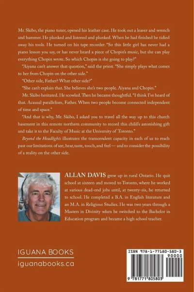 Mr. Skibo, the piano tuner, opened his leather case. He took out a leaver and wrench and hammer. He plunked and listened and plunked. When he had finished he tidied away his tools. He turned on his tape recorder. "So this little girl has never had a piano lesson you say, or has never heard a piece of Chopin's music, but she can play everything Chopin wrote. So which Chopin is she going to play?" "Aiyana can't answer that question," said the priest. "She simply plays what comes to her from Chopin on the other side." "Other side, Father? What other side?" "She can't explain that. She believes she's two people. Aiyana and Chopin." Mr. Skibo hesitated. He scowled. Then he became thoughtful. "I think I've heard of that. Acausal parallelism, Father. When two people become connected independent of time and space." "And that is why, Mr. Skibo, I asked you to travel all the way up to this church basement in this remote northern community to record this child's astonishing gift and take it to the Faculty of Music at the University of Toronto." Beyond the Headlights illustrates the transcendent capacity in each of us to reach past our limitations of see, hear, taste, touch, and feel - and to consider the possibility of a reality on the other side.
