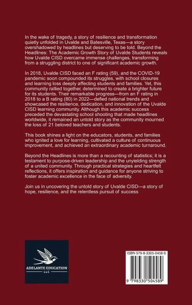 In the wake of tragedy, a story of resilience and transformation quietly unfolded in Uvalde and Batesville, Texas-a story overshadowed by headlines but deserving to be told. Beyond the Headlines: The Academic Growth Story of Uvalde Students reveals how Uvalde CISD overcame immense challenges, transforming from a struggling district to one of significant academic growth. In 2018, Uvalde CISD faced an F rating (59), and the COVID-19 pandemic soon compounded its struggles, with school closures and learning loss deeply affecting students and families. Yet, this community rallied together, determined to create a brighter future for its students. Their remarkable progress-from an F rating in 2018 to a B rating (80) in 2022-defied national trends and showcased the resilience, dedication, and innovation of the Uvalde CISD learning community. Although this academic success preceded the devastating school shooting that made headlines worldwide, it remained an untold story as the community mourned the loss of 21 beloved teachers and students. This book shines a light on the educators, students, and families who ignited a love for learning, cultivated a culture of continuous improvement, and achieved an extraordinary academic turnaround. Beyond the Headlines is more than a recounting of statistics; it is a testament to purpose-driven leadership and the unyielding strength of a united community. Through practical strategies and heartfelt reflections, it offers inspiration and guidance for anyone striving to foster academic excellence in the face of adversity. Join us in uncovering the untold story of Uvalde CISD-a story of hope, resilience, and the relentless pursuit of success.