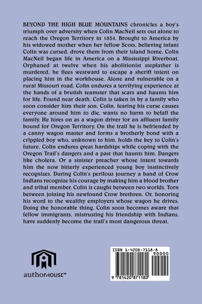 BEYOND THE HIGH BLUE MOUNTAINS chronicles a boy's triumph over adversity when Colin MacNeil sets out alone to reach the Oregon Territory in 1854. Brought to America by his widowed mother when her fellow Scots, believing infant Colin was cursed, drove them from their island home. Colin MacNeil began life in America on a Mississippi Riverboat. Orphaned at twelve when his abolitionist stepfather is murdered, he flees westward to escape a sheriff intent on placing him in the workhouse. Alone and vulnerable on a rural Missouri road, Colin endures a terrifying experience at the hands of a brutish teamster that scars and haunts him for life. Found near death, Colin is taken in by a family who soon consider him their son. Colin, fearing his curse causes everyone around him to die, wants no harm to befall the family. He hires on as a wagon driver for an affluent family bound for Oregon Territory. On the trail he is befriended by a canny wagon master and forms a brotherly bond with a crippled boy who, unknown to him, holds the key to Colin's future. Colin endures great hardships while coping with the Oregon Trail's dangers and a past that haunts him. Dangers like cholera. Or a sinister preacher whose intent towards him the now bitterly experienced young boy instinctively recognizes. During Colin's perilous journey a band of Crow Indians recognize his courage by making him a blood brother and tribal member. Colin is caught between two worlds. Torn between joining his newfound Crow brethren. Or, honoring his word to the wealthy employers whose wagon he drives. Doing the honorable thing, Colin soon becomes aware that fellow immigrants, mistrusting his friendship with Indians, have suddenly become the trail's most dangerous threat.