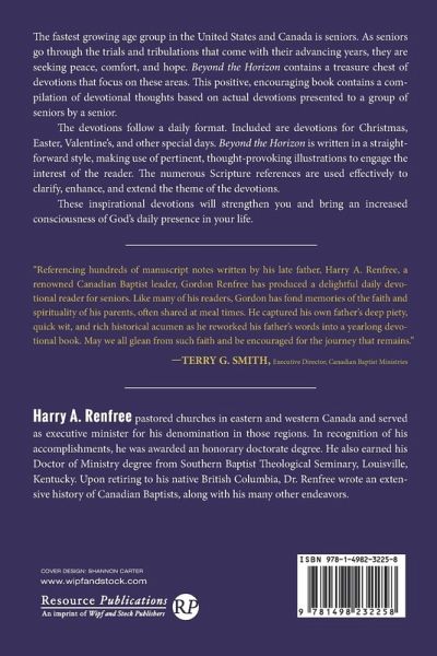 The fastest growing age group in the United States and Canada is seniors. As seniors go through the trials and tribulations that come with their advancing years, they are seeking peace, comfort, and hope. Beyond the Horizon contains a treasure chest of devotions that focus on these areas. This positive, encouraging book contains a compilation of devotional thoughts based on actual devotions presented to a group of seniors by a senior. The devotions follow a daily format. Included are devotions for Christmas, Easter, Valentine's and other special days. Beyond the Horizon is written in a straightforward style, making use of pertinent, thought-provoking illustrations to engage the interest of the reader. The numerous Scripture references are used effectively to clarify, enhance, and extend the theme of the devotions. These inspirational devotions will strengthen you and bring an increased consciousness of God's daily presence in your life. ""Referencing hundreds of manuscript notes written by his late father, Harry A. Renfree, a renowned Canadian Baptist leader, Gordon Renfree has produced a delightful daily devotional reader for seniors. Like many of his readers, Gordon has fond memories of the faith and spirituality of his parents, often shared at mealtimes. He captured his own father's deep piety, quick wit, and rich historical acumen as he reworked his father's words into a yearlong devotional book. May we all glean from such faith and be encouraged for the journey that remains."" --Terry G. Smith, Executive Director, Canadian Baptist Ministries Harry A. Renfree pastored churches in eastern and western Canada and served as executive minister for his denomination in those regions. In recognition of his accomplishments, he was awarded an honorary doctorate degree. He also earned his Doctor of Ministry degree from Southern Baptist Theological Seminary, Louisville, Kentucky. Upon retiring to his native British Columbia, Dr. Renfree wrote an extensive history of Canadian Baptists, along with his many other endeavors.