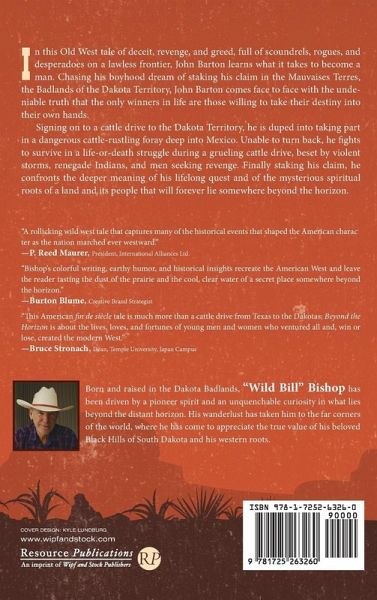 In this Old West tale of deceit, revenge, and greed, full of scoundrels, rogues, and desperadoes on a lawless frontier, John Barton learns what it takes to become a man. Chasing his boyhood dream of staking his claim in the Mauvaises Terres, the Badlands of the Dakota Territory, John Barton comes face to face with the undeniable truth that the only winners in life are those willing to take their destiny into their own hands. Signing on to a cattle drive to the Dakota Territory, he is duped into taking part in a dangerous cattle-rustling foray deep into Mexico. Unable to turn back, he fights to survive in a life-or-death struggle during a grueling cattle drive, beset by violent storms, renegade Indians, and men seeking revenge. Finally staking his claim, he confronts the deeper meaning of his lifelong quest and of the mysterious spiritual roots of a land and its people that will forever lie somewhere beyond the horizon.