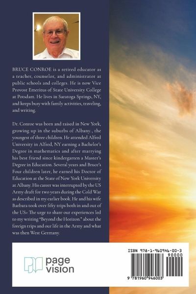 ¿BRUCE CONROE is a retired educator as a teacher, counselor, and administrator at public schools and colleges. He is now Vice Provost Emeritus of State University College at Potsdam. He lives in Saratoga Springs, NY, and keeps busy with family activities, traveling, and writing. Dr. Conroe was born and raised in New York, growing up in the suburbs of Albany, the youngest of three children. He attended Alfred University in Alfred, NY earning a Bachelor's Degree in mathematics and after marrying his best friend since kindergarten a Master's Degree in Education. Several years and Bruce's Four children later, he earned his Doctor of Education at the State of New York University at Albany. His career was interrupted by the US Army draft for two years during the Cold War as described in my earlier book. He and his wife Barbara took over fifty trips both in and out of the US. The urge to share our experiences led to my writing "Beyond the Horizon." about the foreign trips and our life in the Army and what was then West Germany.