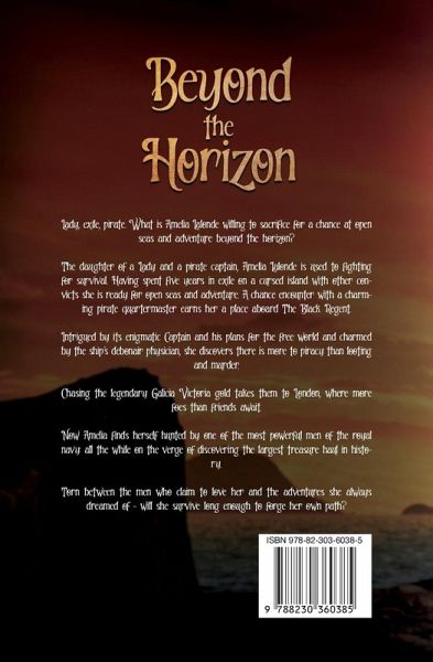Lady, exile, pirate. What is Amelia Lalonde willing to sacrifice for a chance at open seas and adventure beyond the horizon? The daughter of a Lady and a pirate captain, Amelia Lalonde is used to fighting for survival. Having spent five years in exile on a cursed island with other convicts she is ready for open seas and adventure. A chance encounter with a charming pirate quartermaster earns her a place aboard The Black Regent. Intrigued by its enigmatic Captain and his plans for the free world and charmed by the ship's debonair physician, she discovers there is more to piracy than looting and murder. Chasing the legendary Galicia Victoria gold takes them to London, where more foes than friends await. Now Amelia finds herself hunted by one of the most powerful men of the royal navy: all the while on the verge of discovering the largest treasure haul in history. Torn between the men who claim to love her and the adventures she always dreamed of - will she survive long enough to forge her own path?