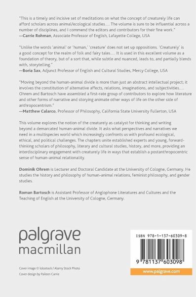 This volume explores the potential of the concept of the creaturely for thinking and writing beyond the idea of a clear-cut human-animal divide, presenting innovative perspectives and narratives for an age which increasingly confronts us with the profound ecological, ethical and political challenges of a multispecies world. The text explores written work such as Samuel Beckett's Worstward Ho and Michel Foucault's The Order of Things, video media such as the film "Creature Comforts" and the video game Into the Dead, and photography. With chapters written by an international group of philosophers, literary and cultural studies scholars, historians and others, the volume brings together established experts and forward-thinking early career scholars to provide an interdisciplinary engagement with ways of thinking and writing the creaturely to establish a postanthropocentric sense of human-animal relationality.