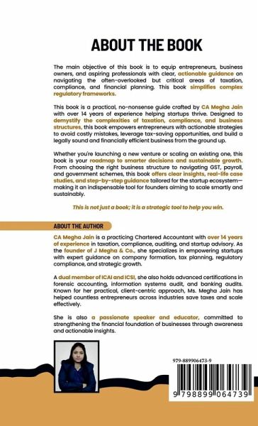 Taxation Essentials and Compliance for Startups. Your go-to guide for understanding and managing the crucial aspects of compliance and taxation from the ground up. Easy-to-understand, and actionable blueprint that will help entrepreneurs a strong financial and legal foundation for your startup. The goal of this book is to empower you with knowledge you need to ensure legal compliance, and leverage tax-saving strategies to enhance profitability and growth.