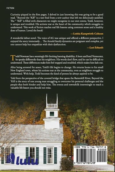 Todd Newman has a seemingly life-limiting learning disability. A born and bred Vermonter, he speaks differently than his neighbors. His words don't flow, and he can be difficult to understand. These differences make him feel trapped and troubled, which makes him lash out. After being arrested for arson, Todd's life begins to change. He returns home to his small New England town, where his actions tear at the community, even as neighbors struggle to understand. With help, Todd becomes the kind of person he always aspired to be. Told from the perspective of the covered bridge that spans the Battenkill River, Beyond the 'Kill is the story of one young man struggling to overcome his personal challenges and the people that both hinder and help him. The events and townsfolk intermingle to teach a valuable life lesson you should not miss.