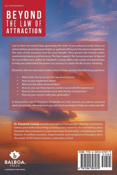 Just as there are natural laws governing the order of your physical world, there are universal laws governing your higher or spiritual self beyond the physical experience. The laws of the universe exist for your benefit. They govern the human realm, maintaining balance and harmony. The laws support the human journey. In Beyond the Law of Attraction, author Dr. Elizabeth Conway offers a discussion of universal laws to help you understand the power you possess to create the life of your choosing. Elizabeth, who has intensely studied universal laws, answers the following questions: • What is the The Secret and the law of attraction? • How do you implement them? • What are the other universal laws? • How do you use these laws to create a successful life experience? • How do the universal laws work with the law of attraction? • How do you connect with your spirituality? In Beyond the Law of Attraction, Elizabeth not only teaches you about universal spiritual concepts, she empowers you with the knowledge to help you create your life.