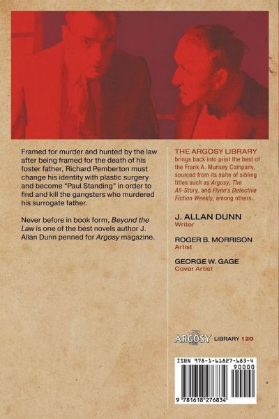 Framed for murder and hunted by the law after being framed for the death of his foster father, Richard Pemberton must change his identity with plastic surgery and become "Paul Standing" in order to find and kill the gangsters who murdered his surrogate father. Never before in book form, Beyond the Law is one of the best novels author J. Allan Dunn penned for Argosy magazine.