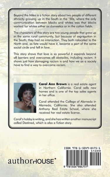 Beyond the Miles is a fiction story about two people of different ethnicity growing up in the South in the '50s, where the only communication between blacks and whites was that blacks worked for whites either as domestics or in the cotton fields. The characters of this story are two young people that grew up in the same rural community, but because of segregation in the South, they had no interaction. They both relocated to the North and, as fate would have it, became a part of the same social circle and fell in love. This story shows that love is so powerful it expands beyond all barriers and overcomes all obstacles, including racism. It shows just how damaging racism is and how we as a society have to find a way to overcome racism.