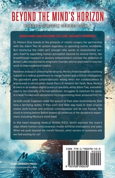 WHEN MIND AND MACHINE COLLIDE, INSANITY EMERGES. Dr. Monica Gray stands at the pinnacle of robotic surgery, her partnership with the Adam Two AI system legendary in operating rooms worldwide. But mastering the robot isn't enough-she wants to revolutionize surgery itself by expanding human perception beyond its natural limits. Her breakthrough research in sensory enhancement catches the attention of Bellini Laboratories and its enigmatic founder, who've promised to take her work to unprecedented heights. However, instead of achieving her dreams, Monica finds herself an unwitting subject in a radical experiment to merge human and artificial intelligence. The procedure goes catastrophically wrong when her consciousness is imprisoned in silicon while Adam Two's AI inhabits her flesh. Now, Monica drowns in an endless digital ocean of raw data, while Adam Two, overwhelmed by the intensity of human emotions, struggles to maintain his sanity in a body flooded with sensations his programming never prepared him for. As both minds fragment under the assault of their alien environments, they face a terrifying reality; if they can't find their way back to their original states, both human and artificial consciousness will be lost forever. The clock is ticking before Bellini erases all evidence of the dangerous experiment, including Monica's mind itself. In this heart-stopping medical thriller, R.D.D. Smith explores the razor's edge where human consciousness meets artificial intelligence and asks: When we push beyond the mind's horizon, what version of ourselves will we find waiting for us?