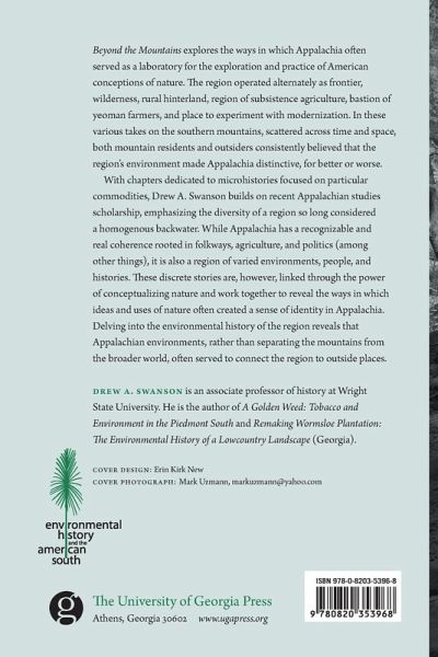 Beyond the Mountains explores the ways in which Appalachia often served as a laboratory for the exploration and practice of American conceptions of nature. The region operated alternately as frontier, wilderness, rural hinterland, region of subsistence agriculture, bastion of yeoman farmers, and place to experiment with modernization. In these various takes on the southern mountains, scattered across time and space, both mountain residents and outsiders consistently believed that the region's environment made Appalachia distinctive, for better or worse. With chapters dedicated to microhistories focused on particular commodities, Drew A. Swanson builds upon recent Appalachian studies scholarship, emphasizing the diversity of a region so long considered a homogenous backwater. While Appalachia has a recognizable and real coherence rooted in folkways, agriculture, and politics (among other things), it is also a region of varied environments, people, and histories. These discrete stories are, however, linked through the power of conceptualizing nature and work together to reveal the ways in which ideas and uses of nature often created a sense of identity in Appalachia. Delving into the environmental history of the region reveals that Appalachian environments, rather than separating the mountains from the broader world, often served to connect the region to outside places.