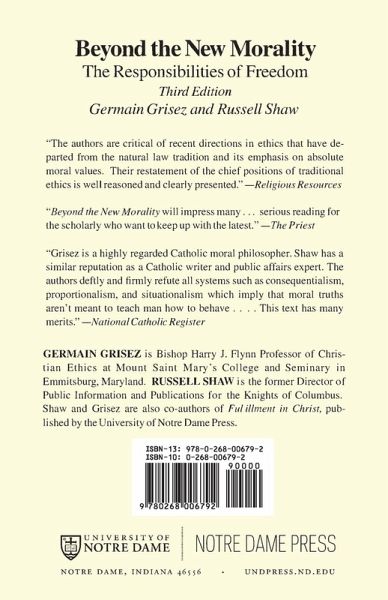 First published in 1974, with a second, revised edition in 1980, Beyond the New Morality has been used widely in introductory ethics courses at the undergraduate level. The book appeals to those who want something not overburdened with theory, and presented in a contemporary idiom. In this third edition of the now standard classroom text, Grisez and Shaw retain the best elements of the earlier versions, including their clear, straightforward presentation and use of nontechnical language. Although the basic approach, content, and organization remain substantially the same, the new edition does develop and amend some aspects of the theory. For example, the community dimension of morality is brought out more clearly and the first principle of morality is now formulated more accurately in terms of willing in line with integral human fulfillment.