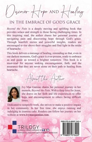 Discover hope and healing in the embrace of God's grace. Beyond the Pain is a deeply moving and uplifting book that provides solace and strength to those facing challenging times. In this inspiring read, the author shares her personal journey of navigating pain and discovering hope through God's grace. Through heartfelt stories and powerful insights, readers are encouraged to rise above their struggles and find light in the midst of heartache. This book delivers a message of healing, reminding us that, even in our darkest moments, God's grace is ever-present, ready to embrace us and guide us toward a brighter tomorrow. This book is a must-read for anyone seeking encouragement, faith, and the assurance that they are never alone in their path to healing from heartache.