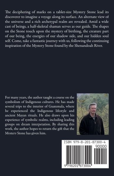 The deciphering of marks on a tablet-size mystery stone lead its discoverer to imagine a voyage along its surface. An alternate view of the universe and a rich archetypal realm are revealed. Amid a wide cast of beings, a half-skeletal shaman serves as our guide. The shapes on the Stone touch upon the mystery of birthing, the creature part of our being, the energies of our shadow side, and our hidden soul self. Come, take a fantastic journey with us, following the continuing inspiration of the Mystery Stone found by the Shenandoah River.