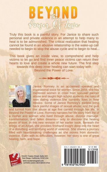 Truly this book is a painful story. For Janice to share such personal and private violence in an attempt to help many to heal is to be admonished. The critical realization that healing cannot be found in an abusive relationship is the wake-up call needed to begin to stop the abuse cycle and to begin to heal... This book gives an inside view, to comprehend and help victims to let go and find inner peace victims can return their hearts to love and create a whole new future. The first step towards this deep inner healing can start today with Beyond the Power of Love.